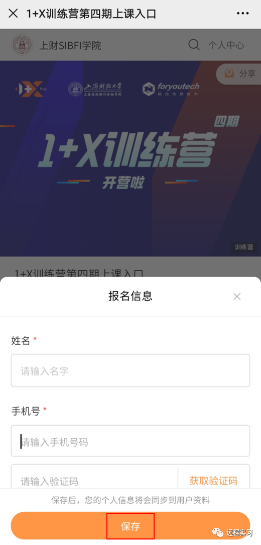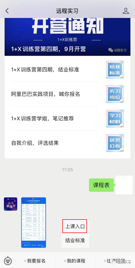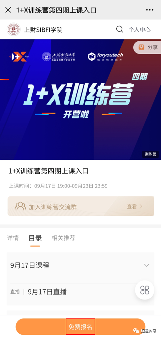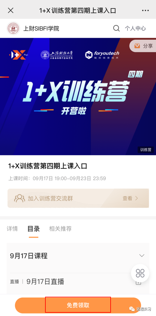 1+X训练营上课指南 1537 2020-9-18 16:07:33 1. 点击“我的课程” -> 点击“上课入口”2. 三期老学员点击“免费领取”即可加入学习。四期新学员点击“免费报名”,填写报名训练营时的姓名与手机号,用以验证报名信息。3. 训练营开始后自动解锁,点击课程名称即可进入直播课或录播课的学习。4. 点击“查看”,加入训练营学习交流群,更多训练营通知将在群内进行。5. 课程均支持回看。直播课结束后点击原课程链接即可进入回看。回看有效期为9月30日23:59。